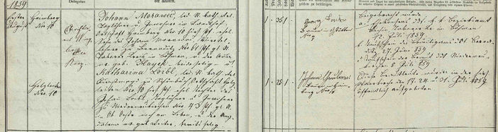 Johann Morawec, led. St. kath. Rel., Taglöhner und Inwohner im Landlhof, Ortschaft Haimberg Nr. 10 hies. Pf., ehel. Sohn des Johann Morawec Viertellehner zu Bernaditz Nr. 61, Pfarre Bernaditz in Böhmen Pf. gl. Ö. im Taborer Kreis Böhmen, und der Anna ux geb. Hayek - beide seel.