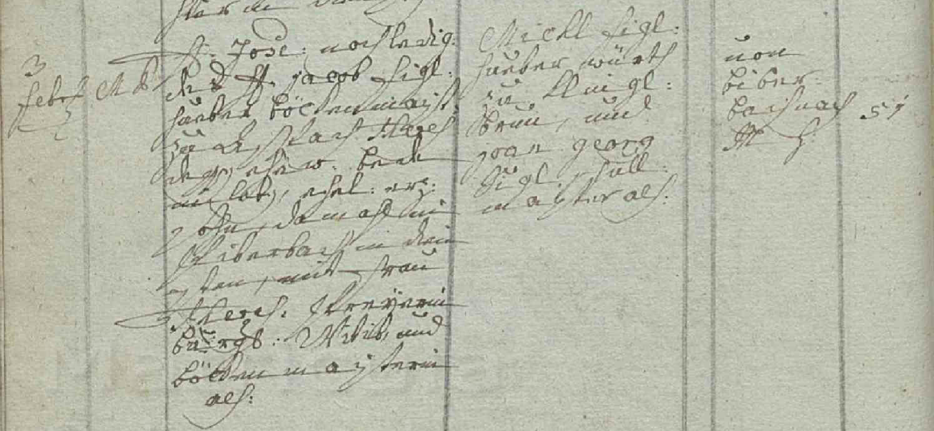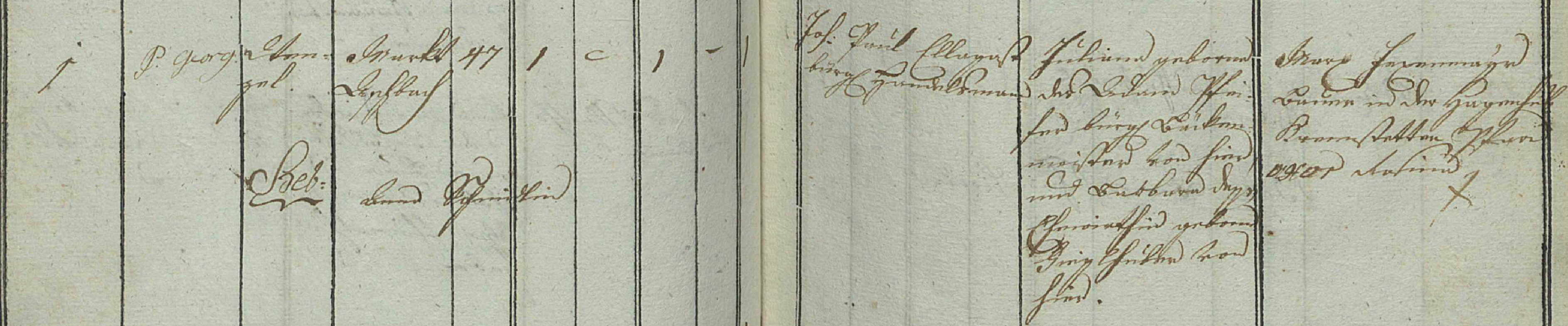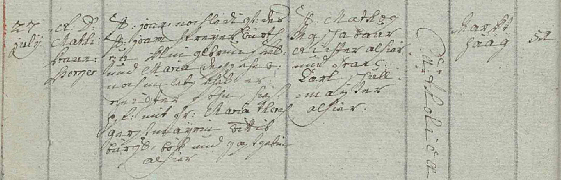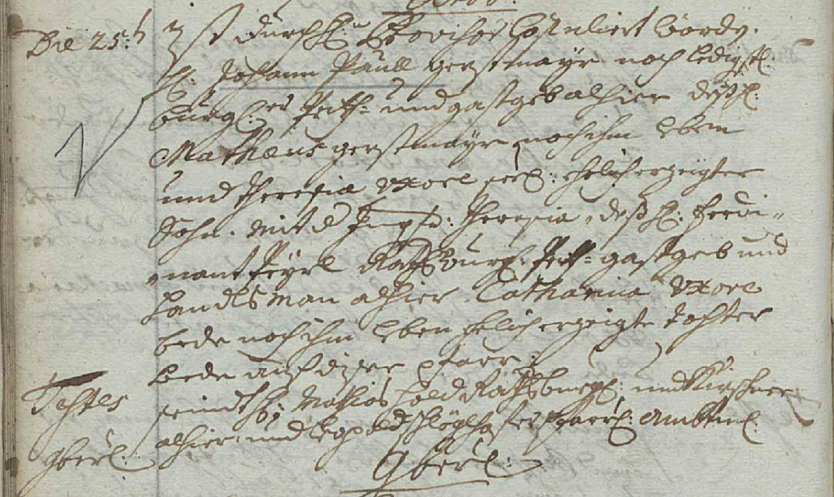 die 25. ist durch Herrn Provisor copuliert worden Herr Johann Paul Gerstmayr noch ledigen Standes: bürgerlicher Pöckh und Gastgeb alhier des Herrn Mathäus Gerstmayr noch ihm Leben und Theresia uxore seelig: ehelich erzeigter Sohn. Mit de Jungfrau Theresia, des Herrn Ferdinant Peyrl Rathsbürger Pöckh Gastgeb und Handlsman alhier. Catharina uxore bede noch ihm Leben ehelich erzeigte Tochter bede aus diser Pfarr.