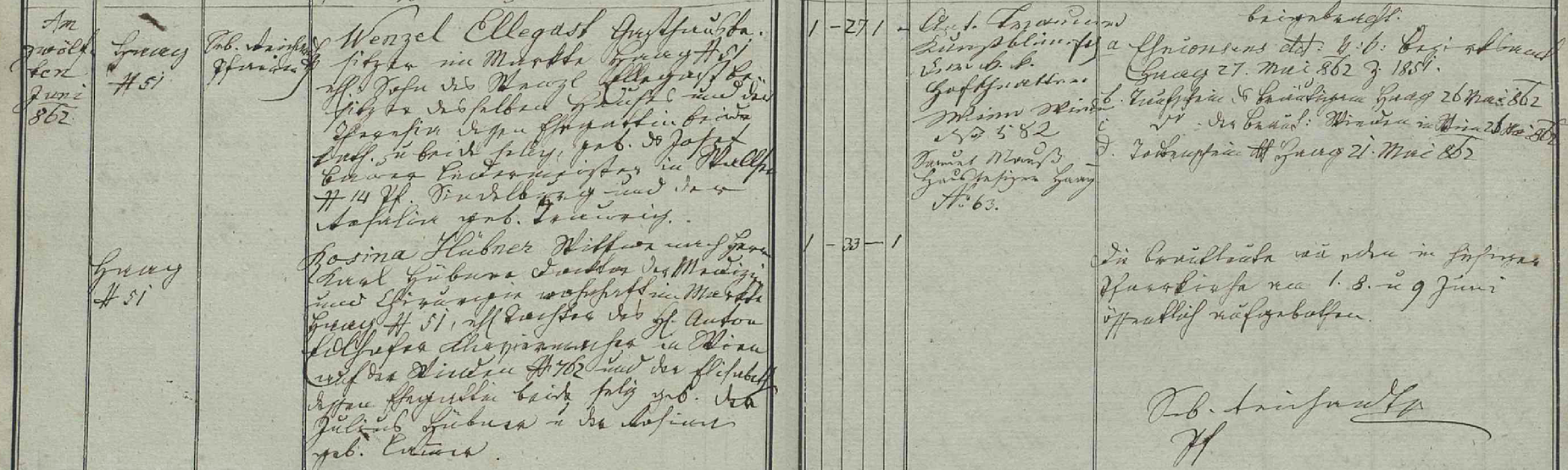 Rosina Hübner, Witwe nach Herrn Karl Hübner, Docktor der Medizin und Chirurgie, wohnhaft im Markt Haag Nr. 51, ehel. Tochter des Herrn Anton Edelhofer, Klaviermacher in Wien auf der Wieden Nr. 762, und der Elisabeth, dessen Ehegattin, beide selig, geb. des Julius Hübner und der Rosina, geb. Bauer.