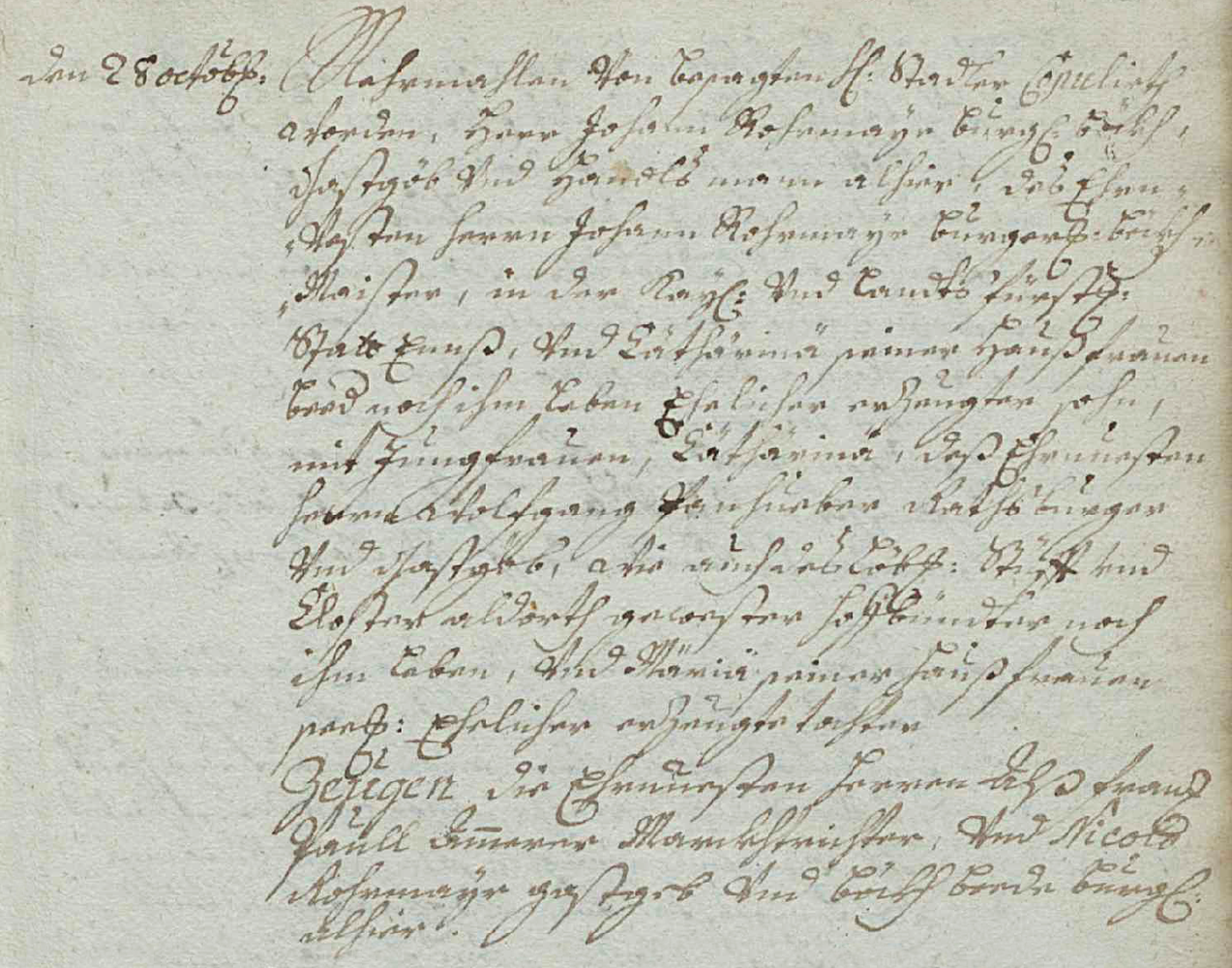 den 28. October ... von besagten Herrn Stadler copuliert worden, Herr Johann Rohrmayr, bürgerlicher Böckh, Gastgeb und Handls mann allhier, des ehrenwertesten Herrn Johann Rohrmayr bürgerlicher Böckh Maister, in der kayserlich und landesfürstlichen Statt Enns, und Catharina seiner Hausfrauen beed noch ihm Leben ehelicher erzeugter Sohn mit Jungfrauen Catharina, des ehrnwerten Herrn Wolfgang Panhueber Rathsbürger und Gastgöb, ..... , Stift und Kloster aldorth, gewester Hofbündter noch ihm Leben, und Maria seiner Huasfrauen seelig, ehelicher erzeugte Tochter.