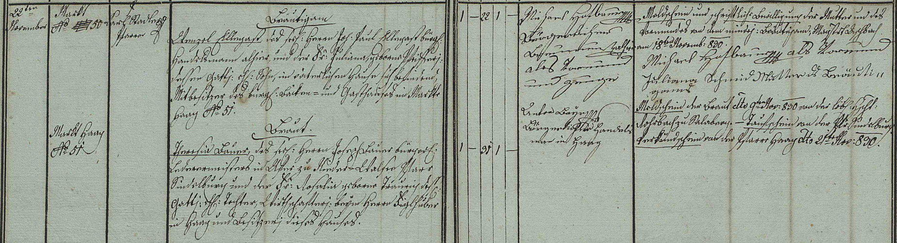 Wenzel Ellegast, des seeligen Herrn Johann Paul Ellegast, bürgerlicher Handelsmann alhier und der Juliana geborene Pfeiffer dessen Gattin ehelicher Sohn, im väterlichen Hause, Mitbesitzer des bürgerlichen Bäcker- und Gasthauses im Markte Haag Nr. 51.