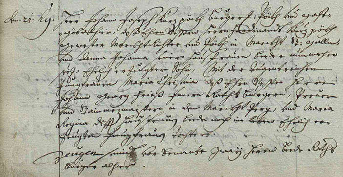Herr Johann Josef Kurzpöckh bürgerlicher Pöckh und Gastgöb alhier, des ehrnvesten Herrn Ferdinandt Kurzpöckh gewester Marckhtrichter und Pöckh im Marckht St. Galln und Anna Johanna seiner Hausfrauen beede nunmehr seelig, ehelich erzeugter Sohn, mit der tugentreichen Jungfrauen Maria Christina des Ehrnwerten Herrn Johann Georg Frieß Innern Rathsbürger, Preuer und Stainmezmaister in dem Marckht Perg, und Maria Regina dessen Hausfrauen beede noch im Leben ehelich erzeugter Jungfrauen Tochter.