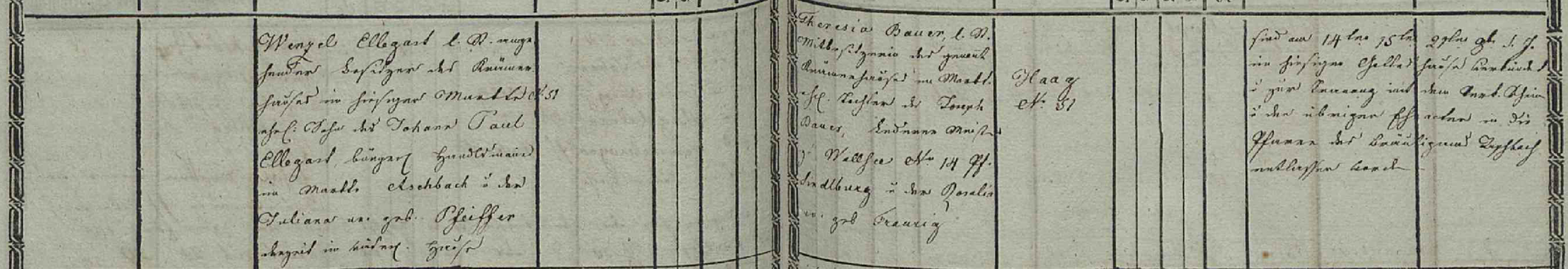 Wenzel Ellegast, Gasthausbesitzer im Markte Haag Nr. 51, ehelicher Sohn des Wenzel Ellegast, Besitzer des selben Hauses und der Theresia dessen Ehegattin, beide katholisch und beide selig, geboren des Josef Bauer, Bindermeister in Wallsee Nr. 14 Pfarre Sindlburg und der Rosalia geb. Traurig.
