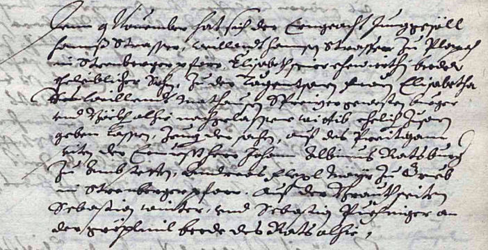 Den 9. November hat sich der ehrngeacht Junggesöll Hannß Strasser, weillandt Hannß Strasserzu Plapach in Strenberger Pfarr, Elisabeth seine Ehewirthin, beeder eheleiblicher Sohn, zu der tugentsamben Frau Elisabetha weillandt Mathiasen Spreizer gewester Bürger und Böckh alhier nachgelassne Wittib ehelich zusamben geben lassen.