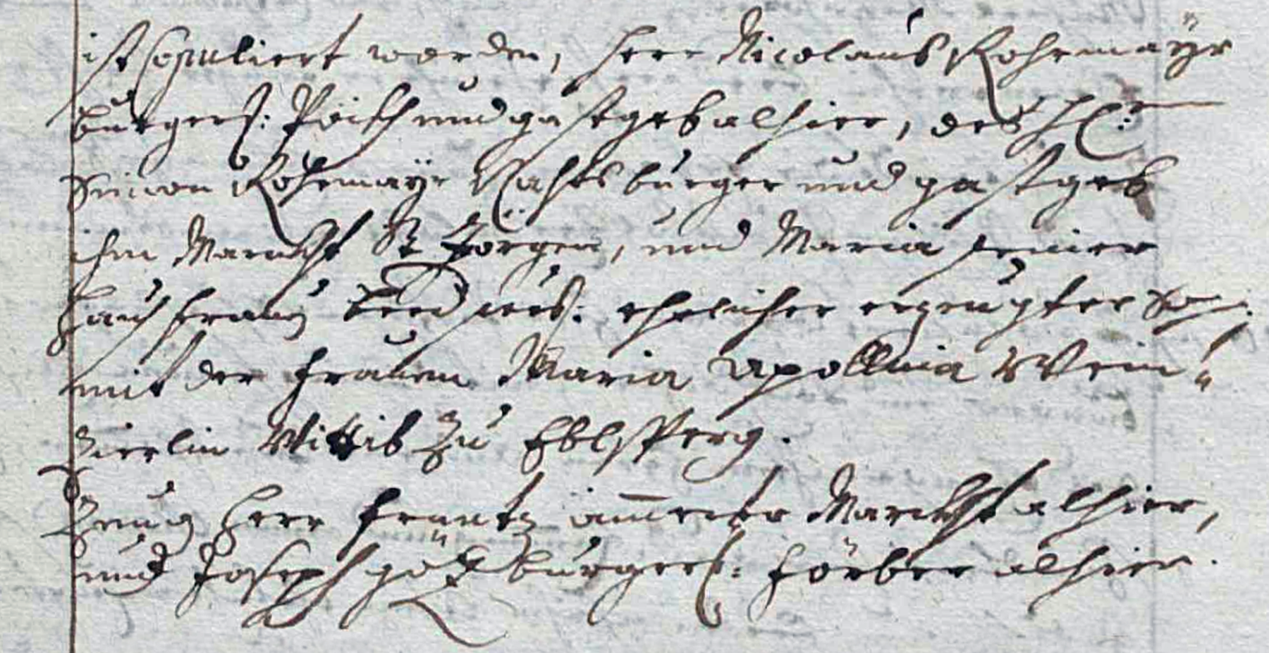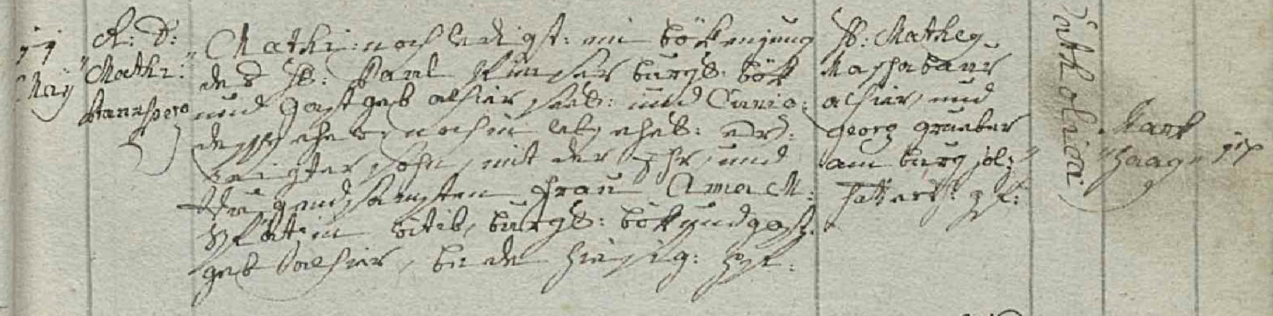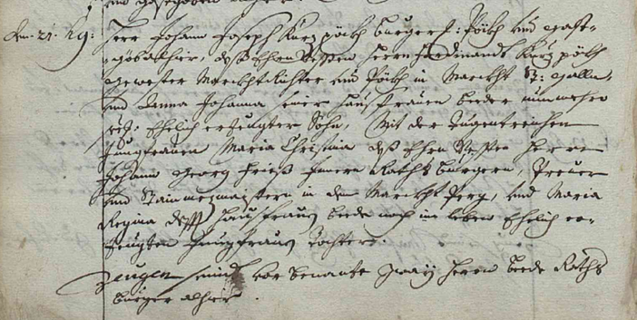 Herr Johann Joseph Kurzpöckh bürgerlicher Pöckh und Gastgeb alhier, deß ehrnvesten Herrn Ferdinand Kurzpöckh, gewester Markhtrichter und Pöckh im Markht St. Galln, und Anna Johanna seiner Hausfrauen beede nunmehro seelig, ehelich erzeugter Sohn, mit der tugentreichen Jungfrauen Maria Christina deß ehrnvesten Herrn Johann Georg Frieß Innern Raths Bürger, Preuer und Stainmezmaister in dem Markht Perg, und Maria Regina dessen Hausfrauen beede noch im Leben, ehelich erzeugte Jungfrauen Tochter.