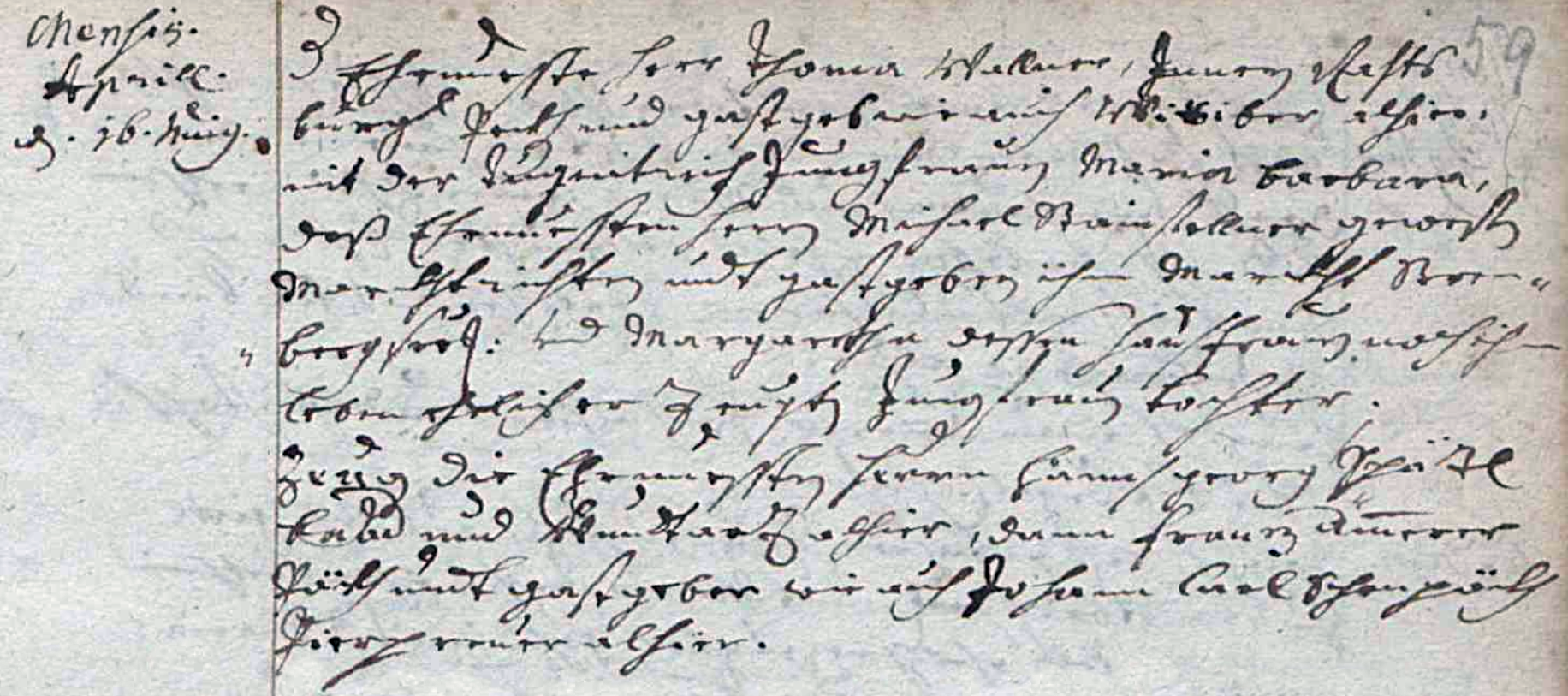 Herr Thoma Wallner, Inner Rathsbürger Pöckh und Gastgeb und auch Wittiber alhier mit der tugentreich Jungfrau Maria Barbara deß Herrn Michael Stainfellner gewester Marktrichter und Gastgeber ihm Markt Strenberg seelig, und Margaretha dessen Hausfrauen noch ihm Leben,ehelich erzeugte Jungfrau Tochter.