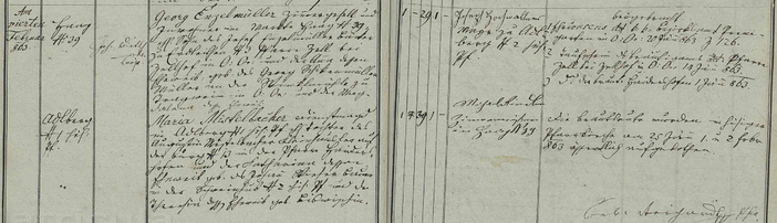 Georg Enzelmüller Zimmergsöll und Inwohner im Markt Haag Nr. 39, ehelicher Sohne des Josef Enzelmüller bäter zu Erdleithen Nr. 3 Pfarre Zell bei Zellhof in O.Ö. und der Anna dessen Eheweib, geboren des Georg Schikermüller, Müller an der Winklmühle zu Tragwein in O.Ö. und der Magdalena dessen Eheweib.