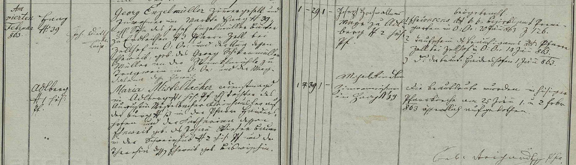 Maria Mistelbacher Dienstmagd in Adlberg Nr. 1 hiesige Pfarre, eheliche Tochter des Augustin Mistelbacher, Kleinhäusler auf der Burg Nr. 13 in der Pfarre Haidershofen und der Katharina dessen Eheweib geboren des Johann Wieser, Bauer in der Schweinhub Nr. 2 hiesige Pfarre und der Theresia dessen Eheweib geborene Biswipfin.