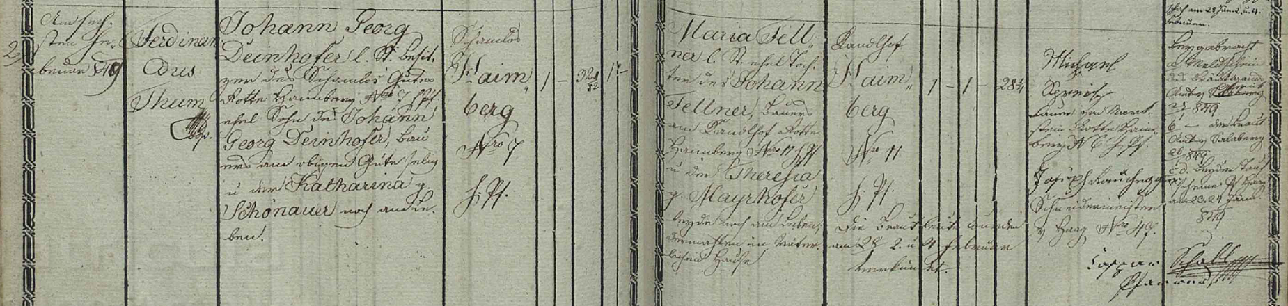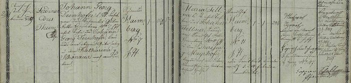 Johann Georg Deinhofer, ledigen Standts, Besitzer des Schamlos Gute, Rotte Haimberg Nr. 7, hiesige Pfarre, ehelicher Sohn des Johann Georg Deinhofer, Bauers am obigen Gute, selig, und der Katharina geb. Schönauer, noch am Leben.