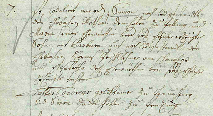 ist copuliert worden Simon, noch ledigen Standts des ehrbaren Mathias Deinhofer zu Palling und Maria seiner Ehewürthin, beed selig ehelich erzeuter Sohn mit Barbara, auch noch ledigen Standts, des ehrbaren Hannß Peischllehner am Schamloß und Elisabetha dessen Ehewürthin beed selig ehelich erzeugte Tochter.