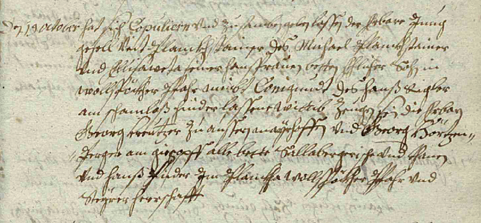 den 19 October hat sich copulieren und zusamben geben lassen der Ehrbar Jung Gesöll Veith Plaukhstainer des Michael Plaukhstainer und Elisabetha seiner Hausfrauen bete Ehlicher Sohn in Wollspöckher Pfahr nimbt Cunigundt des Hanß Rigler am Schamloß hinderlassner Wittib.