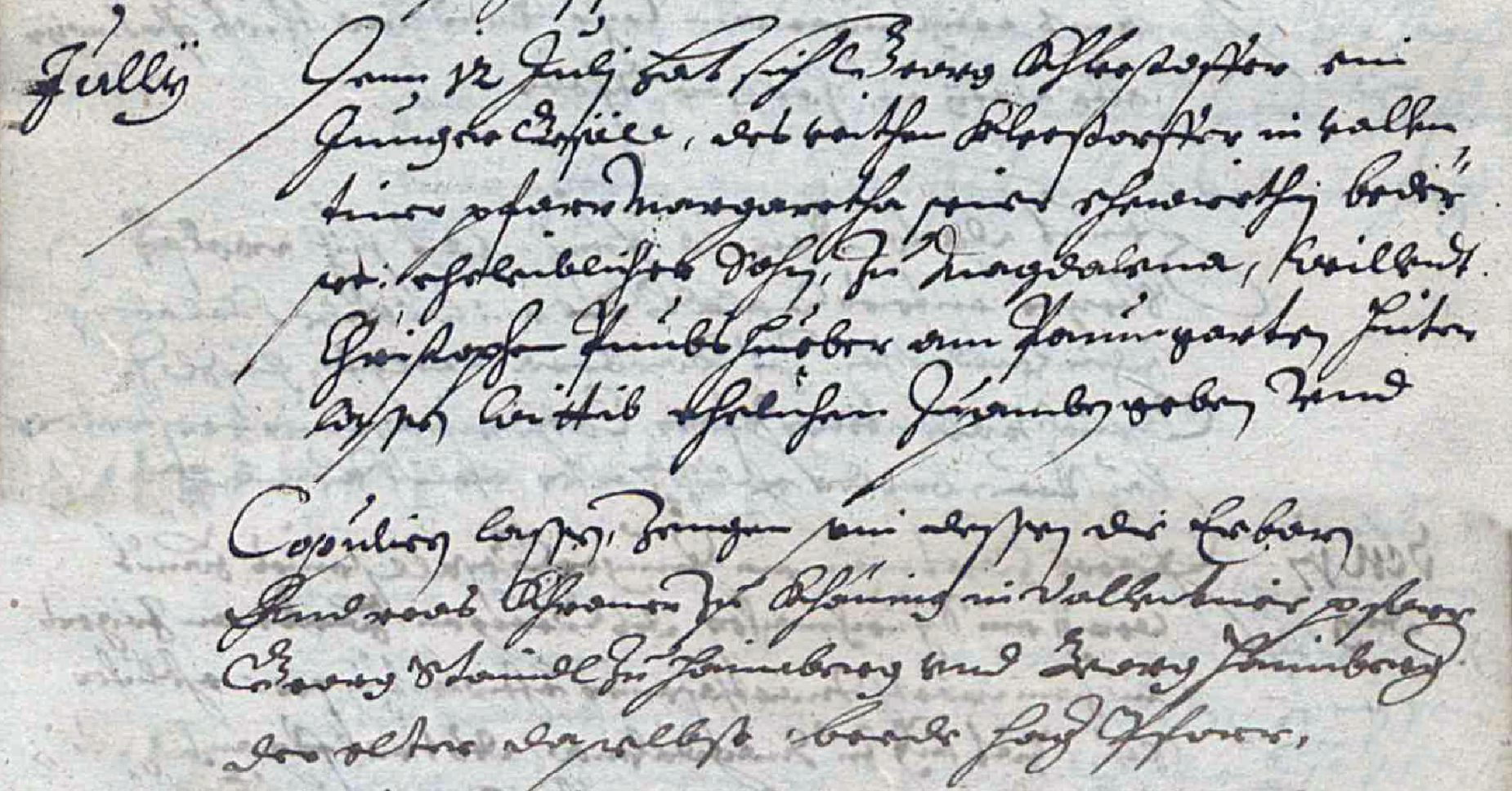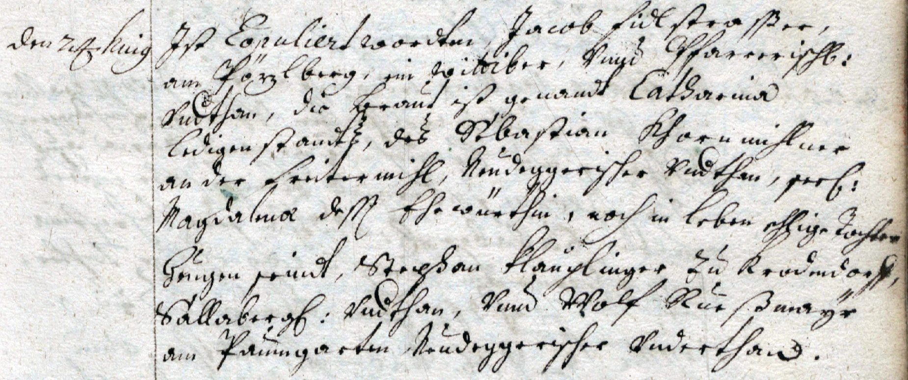 den 24. huig ist copuliert worden, Jacob Fidlstraßer am Pözlberg, ein Wittiber unnd pfarrerischer Undthan, die Braut ist genannt Catharina, ledigen Standts, des Sebastian Khornmihlner an derFreitermihl, Neudeggerischer Undthan, seelig; Magdalena dessen Ehewürthin, noch im Leben, ehlige Tochter. Zeugen seindt, Stephan Klauplinger zu Krodendorf Sallabergerischer Undthan, unnd Wolf Rueßmayr am PAumgarten, Neudeggerischer Underthan.