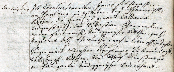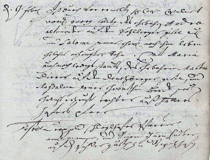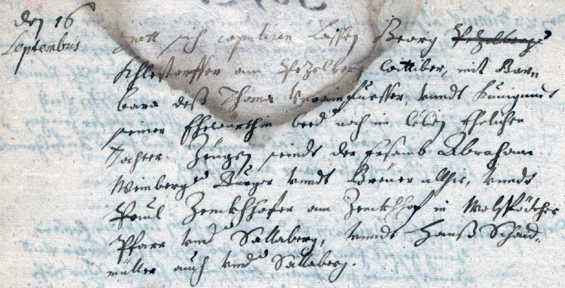 den 16. Septembris hatt sich copulieren lassen Georg Khlestorfer am Pezelberg Wittiber, mit Barbara des Thoma Unrainfussner, undt Kunigundt seiner Ehewürthin beed noch im Leben, eheliche Tochter. Zeugen seindt der ehrsamb Abraham Weinberger Bürger und Breuer allhir, unndt Paul Zinckhhofer am Zinckhhof in Wolspöckher Pfarr under Sallaberg, unndt Hans Schaidmüller auch under Sallaberg.