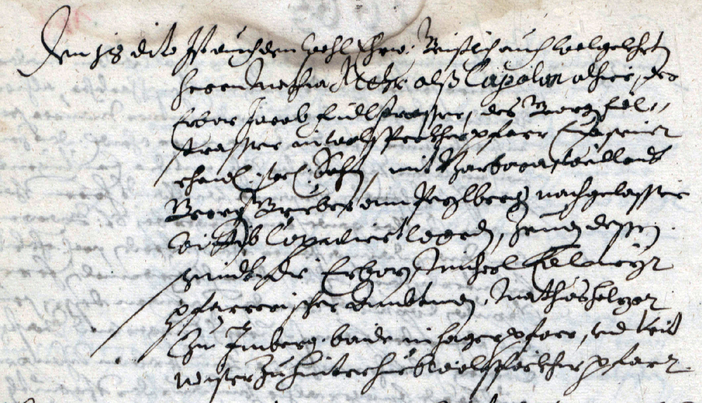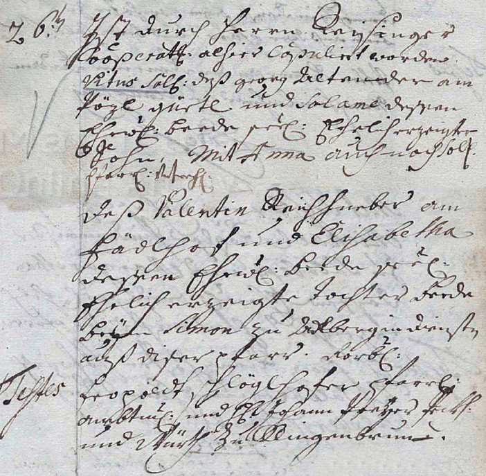Den 18. dito ist durch den wohl ehrwirdig geistlich auch wohlgelehrten Herrn Mathia ... als Capelan alhir, der erbar Jacob Fidlstraßer, des Georg Fidlstraßer in Wolspeckher Pfarr Eva seines Eheweibes ehelicher Sohn, mit Barbara weillandt Georg Gruber am Pezlberg nachgelassne Wittib copuliert worden. Zeug dessen seindt die erbaren Michael Edlmayr pfarrerischer Ambtmann, Mathias Holzer zu Imberg Baide in Hager Pfarr, und Veit Wiser zu Hinterhueb Wolspöckher Pfarr.