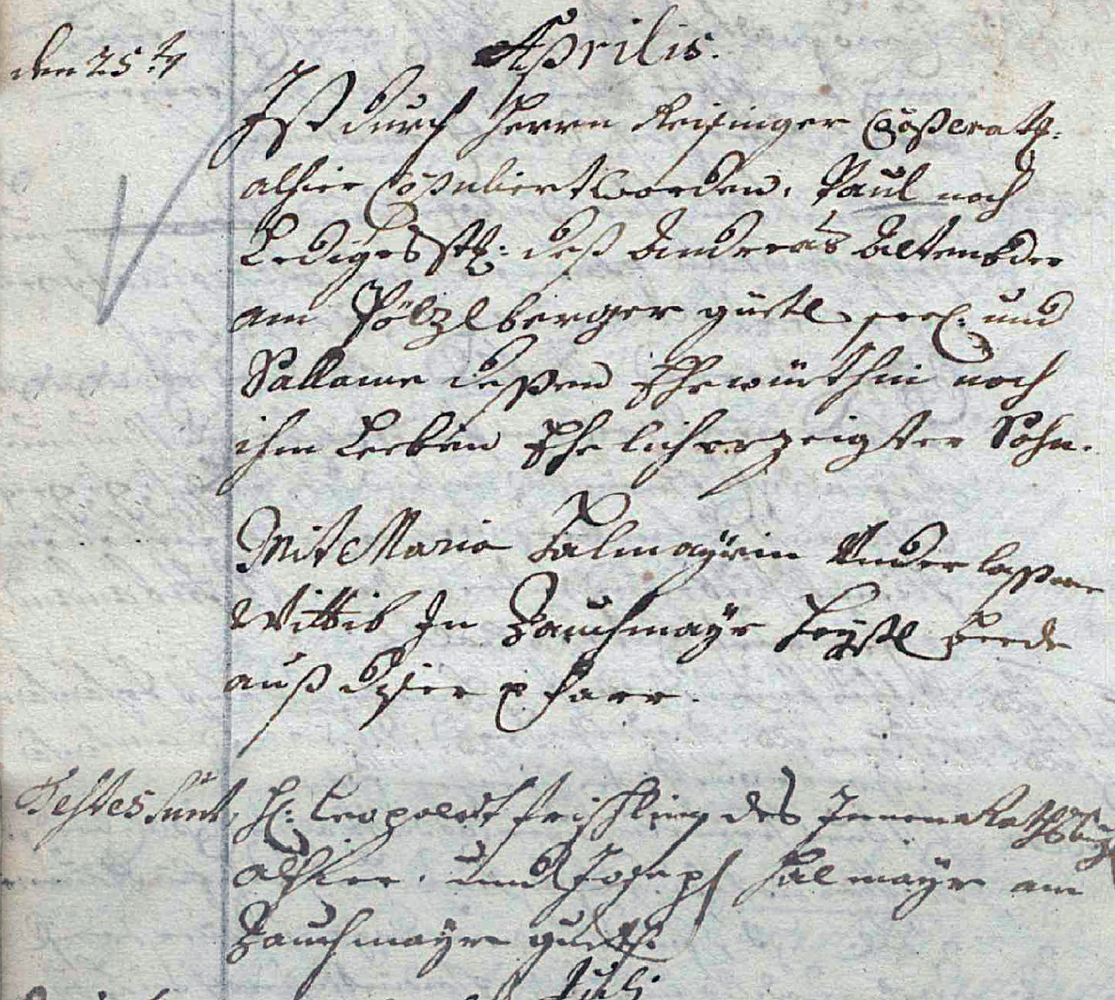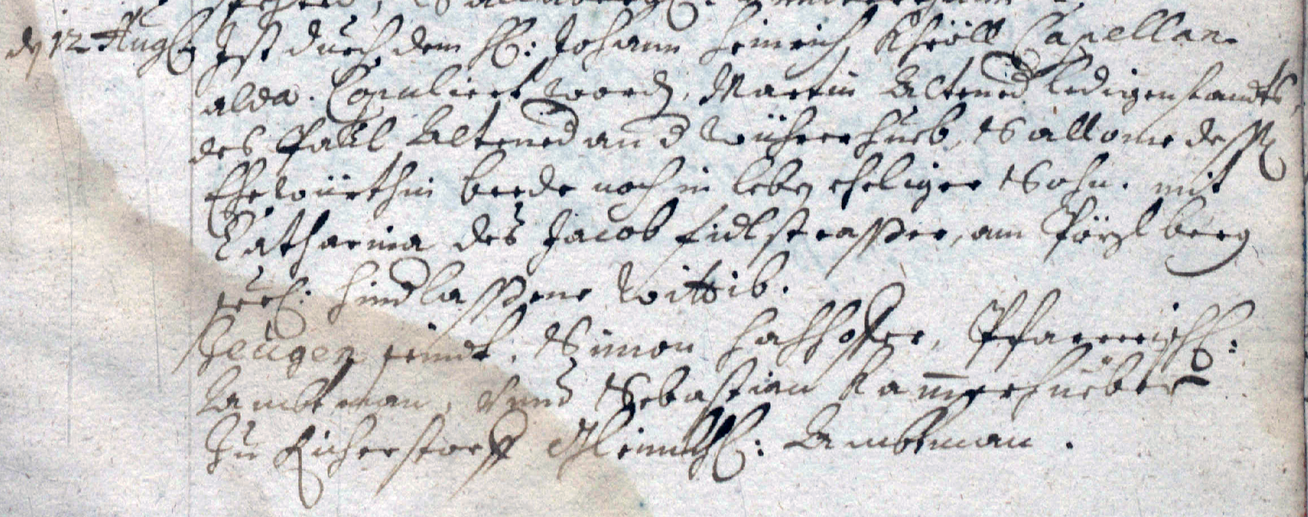 den 12. August ist durch den Herrn Johann Heinrich Khröll Capelan alda copuliert worden, Martin Alteneder ledigen Standts, des Paul Alteneder an der Wührer Hueb Sallome dessen Ehewürthin beede noch im Leben eheliger Sohn mit Catharina des Jacob Fidlstraßer, am Pözlberg seelig hinderlassene Wittib.