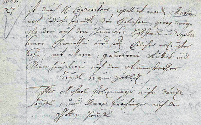 den 27. ist durch Herrn Cooperatore copuliert worden Martin, noch ledigen Standts, des ehrbahren Georg Wögschaider auf dem Schamloser Hofstädl und Sophia seiner Ehewürthin beed seelig, ehelicher erzeugter Sohn, mit Maria Grueberin Wüttib und Klainhäuslerin auf dem Winerstorfer Häusl beim Göbliz.