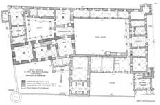 dominieren, gefunden. Hier tragen zarte toskanische Säulen nur halb so große Bögen wie im Erdgeschoß. Diese sind zugleich auch das Maß für die Kreuzgratgewölbe der Arkadengänge. Die Gliederung der Parapetmauer durch die beiden umlaufenden Steingesimse sowie die vertikalen, mit Rhomben dekorierten Steinteile unterhalb der Säulchen geben dem Hof Struktur und fördern den Eindruck der Geschlossenheit. Wenn auch die Arkadengänge der Kommunikation zwischen den Räumen sehr dienlich waren, so gab zweifellos der Wunsch nach Repräsentation den Ausschlag für diese architektonische Lösung. Die Mitte des Hofes nimmt ein Brunnen ein, dessen mächtiges, reich profiliertes Becken aus der Zeit um 1700 stammt.