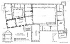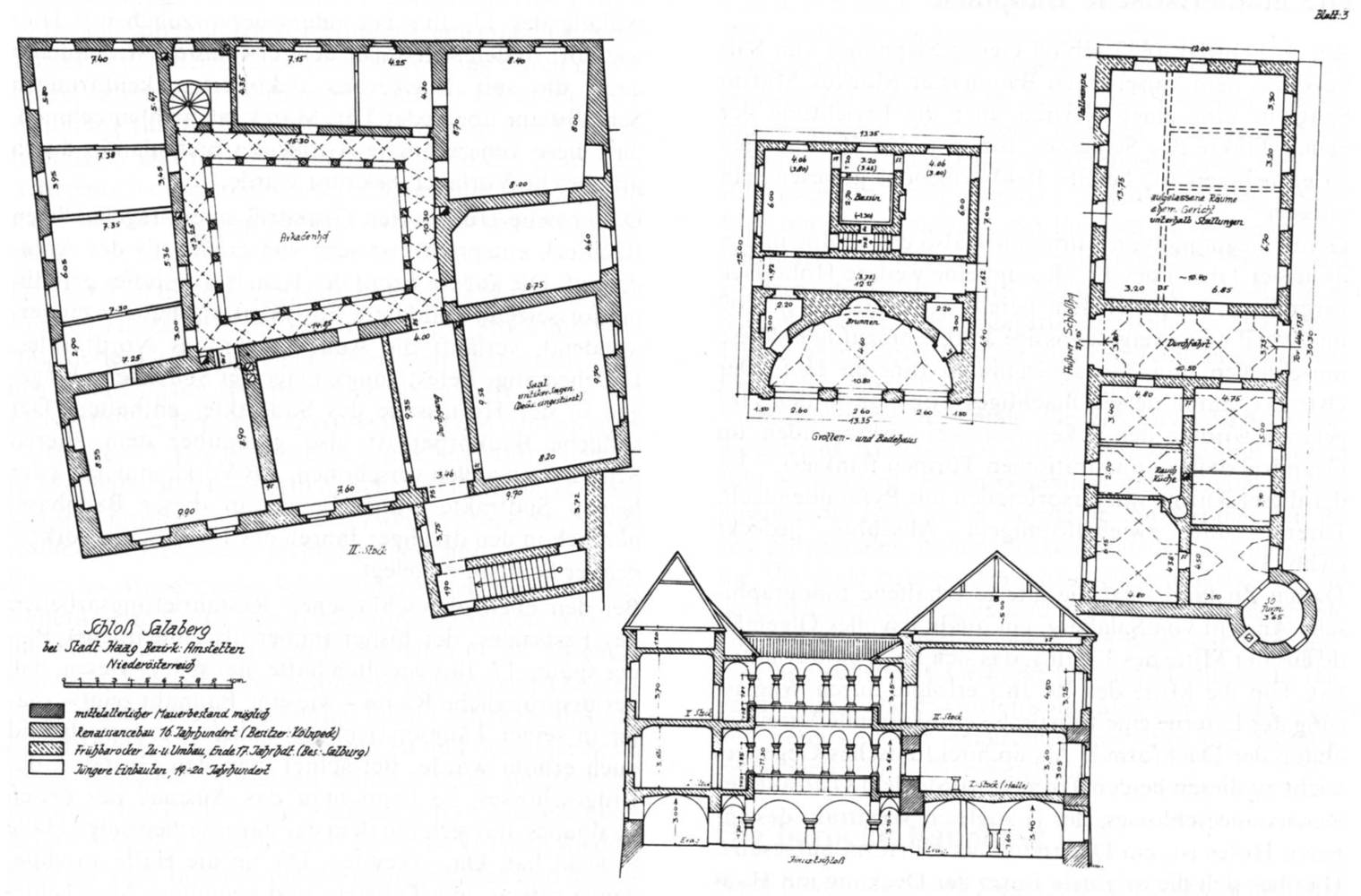 Das architektonische Bild des Schlosses (Abb. I) wird durch drei aneinandergereihte Hofanlagen, die Silhouette des Baues durch die beiden Türme des mittleren Hofes und den Uhrturm des Arkadenhofes bestimmt. Dieser im Westen gelegene Arkadenhof, den der Besucher beim Durchschreiten des Gebäudes zuletzt erreicht und dessen jetziges Erscheinungsbild aus dem 16. Jh. stammt, birgt im Südtrakt die ältesten Bauteile des Schlosses. Aufgrund der hier besonderen Mauerstärken schließt Univ.-Prof. Dr. Adalbert Klaar auf mittelalterliche Bausubstanz nahezu im gesamten Erdgeschoß und im ersten Stockwerk. Weitere mittelalterliche Mauerreste (Textfig-1, 2, 3) sind noch im Ost- und, wie sich bei den Restaurierungsarbeiten 1972 gezeigt hat, auch im Westflügel enthalten, die vermutlich ins 15. Jh. zu datieren sind. Es ist anzunehmen, dass sich in der Südwest-Ecke des heutigen Arkadenhof-Südtraktes der Bergfried befand, an welchen gegen Osten hin der Wohntrakt, der sogenannte Palas der mittelalterlichen Burg angeschlossen war. Der dem Palas und Bergfried im Süden vorgelagerte Halsgraben ist heute noch vorhanden.