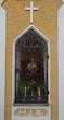 In der Rundbogennische ist ein Gemälde der Heiligen Familie mit dem Text: "Wanderer stehe still, schau an das Bild, kommt dir die Reise zu hart an, dann schaue Jesus, Maria und Josef an." (Q)