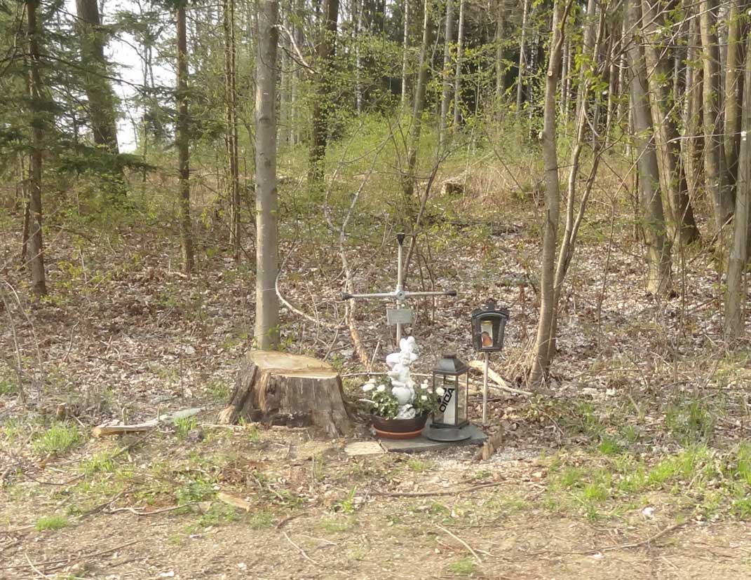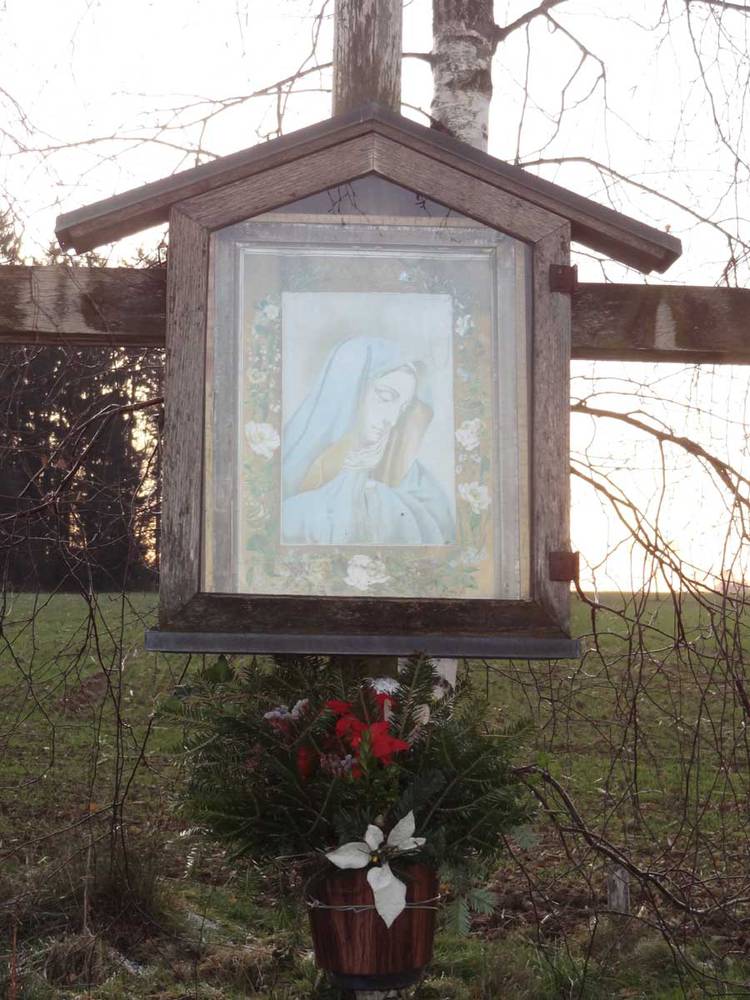 Dieses Kreuz wurde anstelle eines älteren Baumbildes aufgestellt. Das alte Bild wurde zur Danksagung nach einen Unfall beim Baumfällen errichtet.
