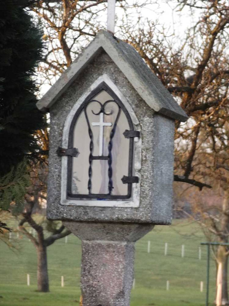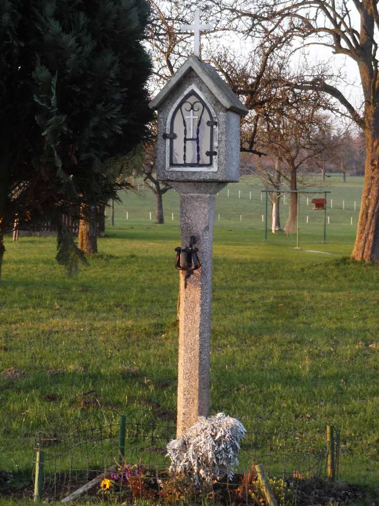 Früher stand an dieser Stelle ein 1914 errichtetes Holzkreuz mit einem holzgeschnitzten Christuskopf.