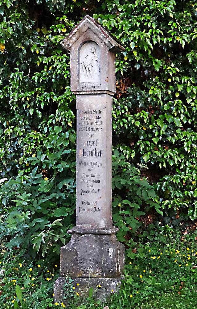 Inschrift: "An dieser Stelle verunglückte am 3. Januar 1909 im 34.Lebensjahr Herr Josef Oberrather, Wirtschaftsbesitzer und Feuerwehrhauptmann von Pinnersdorf. Gedenket seiner im Gebet."