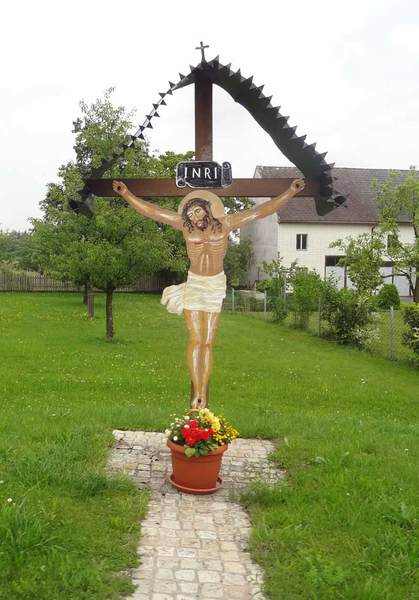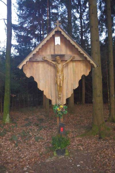 Wegkreuz 1973. Der Besitzer Karl Haussteiner hat dieses Kreuz wegen seiner Genesung errichten lassen. Es wurde vom Schnitzer R. Sauschlager aus Haag angefertigt.