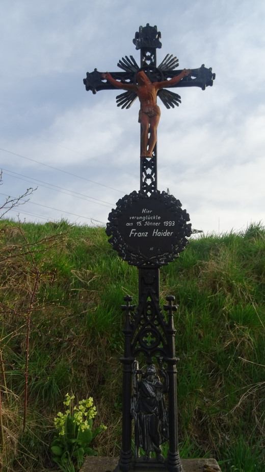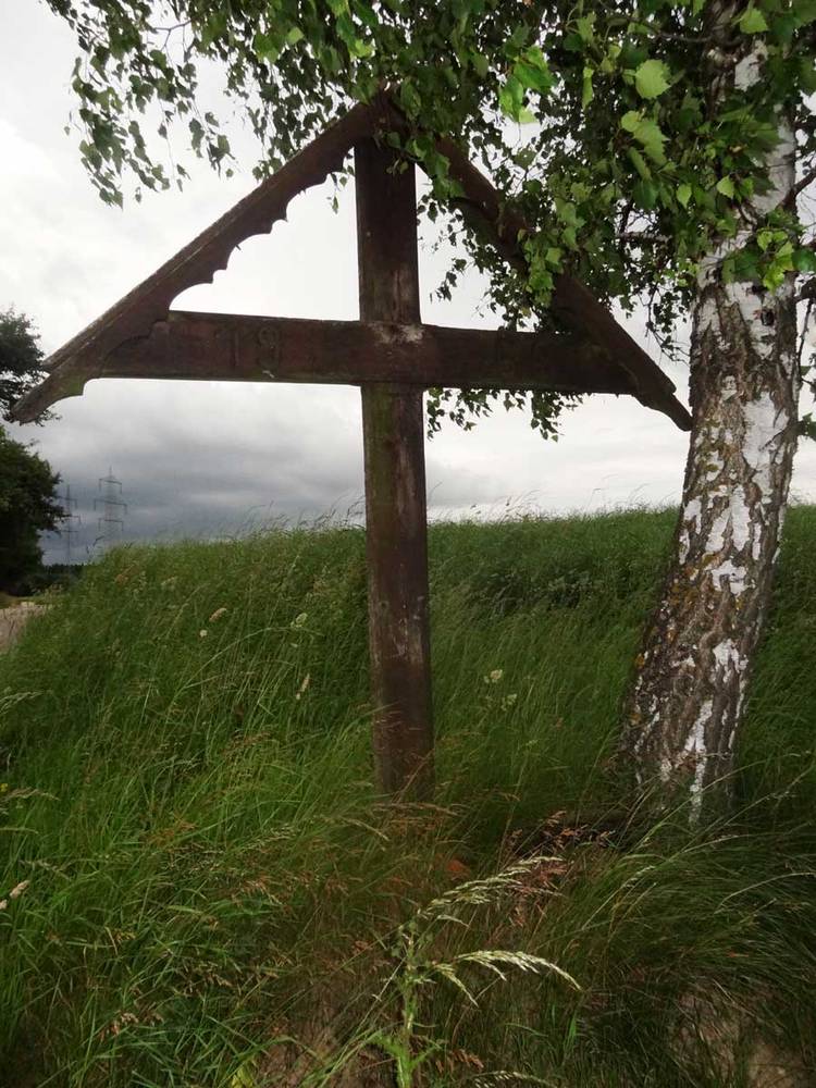 Dieses Kreuz wurde 1898 zum Gedenken an den tödlichen Unfall eines Pferdeknechtes mit seinem Gespann vom gegenüberliegenden Hof (Bauer in Weidach) errichtet. Durch die neue Straßentrasse wurde das Kreuz leicht vesetzt. Das Kreuz mti dem Bild "Christus am Ölberg" ist nach Norden hin ausgerichtet.