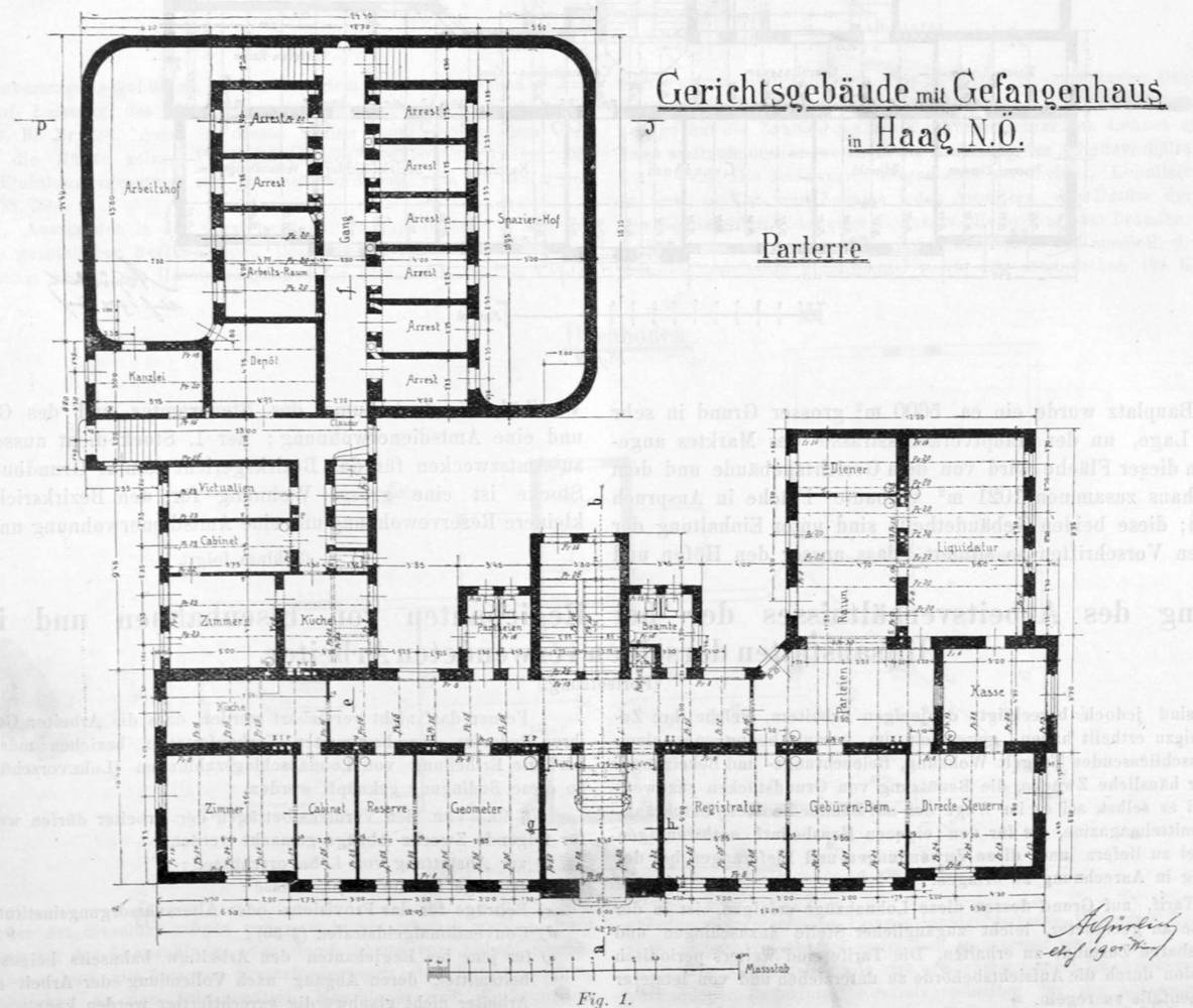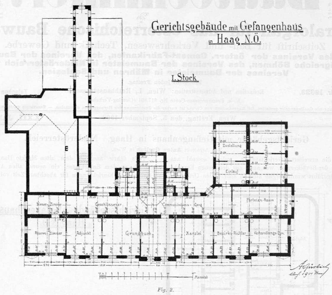 Dies führte auch in dem alten Markte Haag in Niederösterreich zu dem Entsehlusse, ein neues, allen Anforderungen an Grösse und Einrichtungen für absehbare Zeit vollkommen entsprechendes Gebäude für das Bezirksgericht und Gefangenhaus zu erbauen. in welchem auch alle modernen Anforderungen der Humanität und Hygiene erfüllt werden sollen.